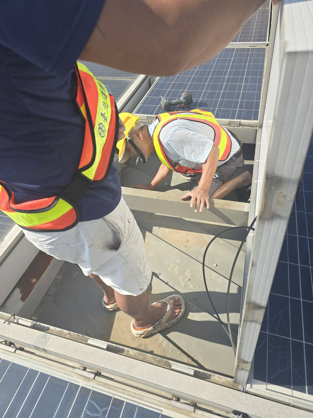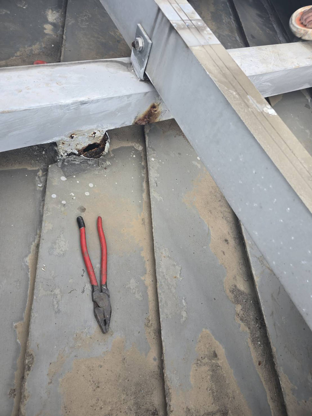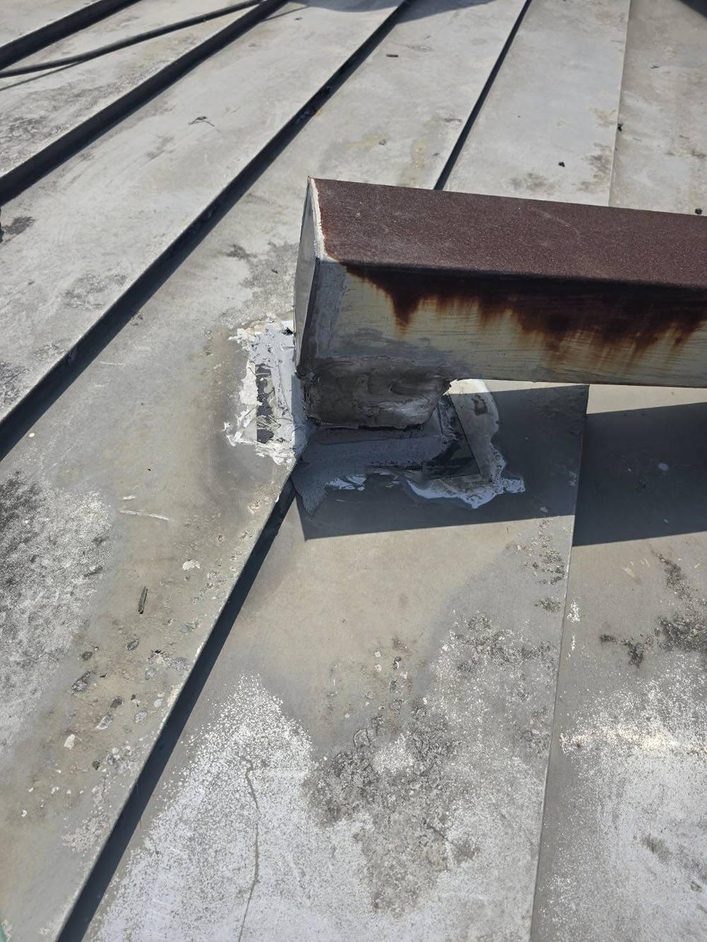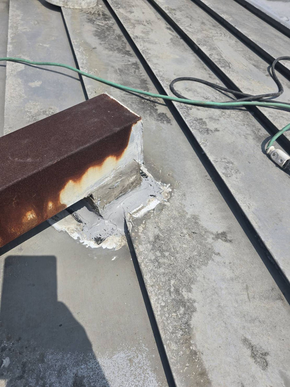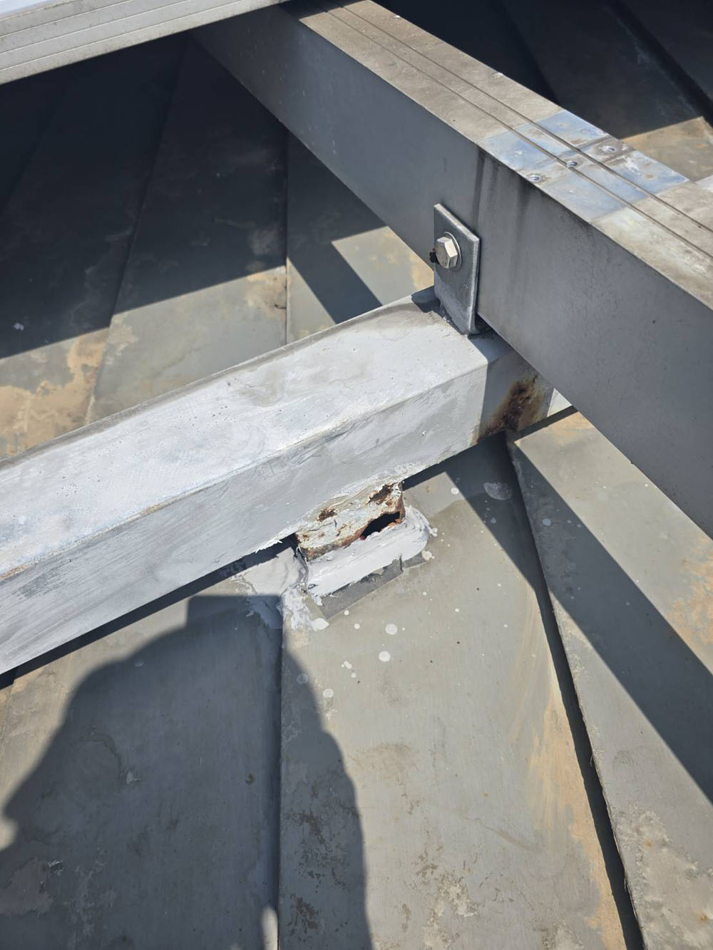 現場勘查發現屋頂太陽能板下方鐵件與穿孔座鏽蝕,雨水沿固定螺栓與微裂縫滲入。處理流程包含鏽蝕清除與防鏽處理、墊片與止水圈更新,穿孔與收邊處以高彈性PU封堵,座腳四周加貼補強布後施作彈性塗膜多道塗佈,並同步加強排水溝、伸縮縫。完工進行24小時積水測試與熱循環觀察,確認無滲漏再交付。