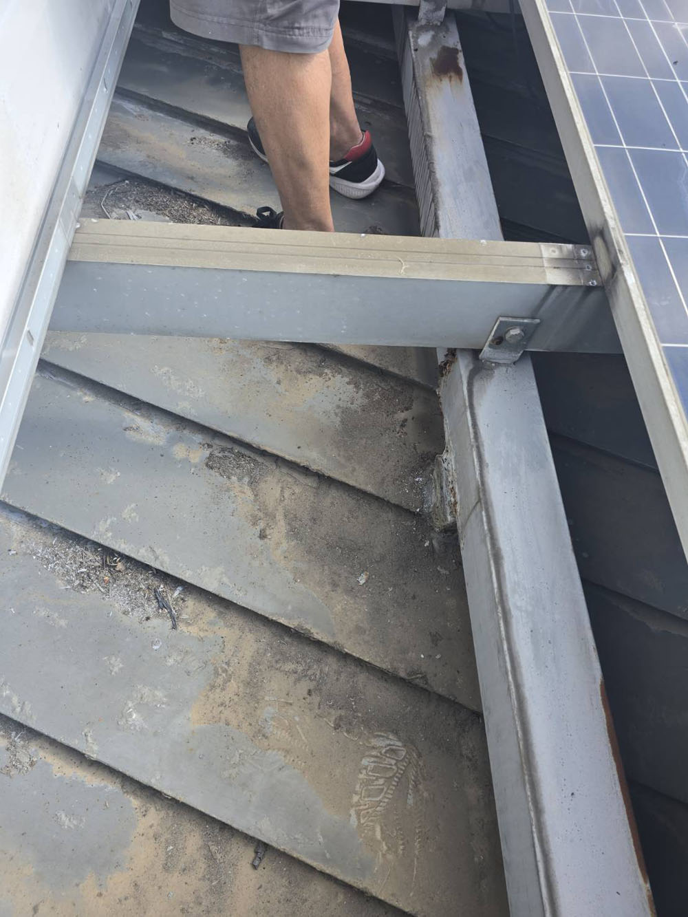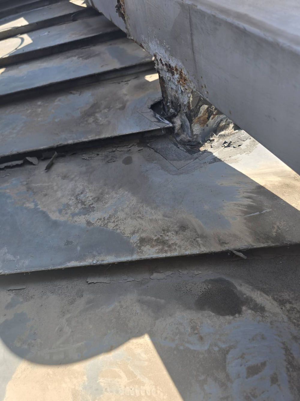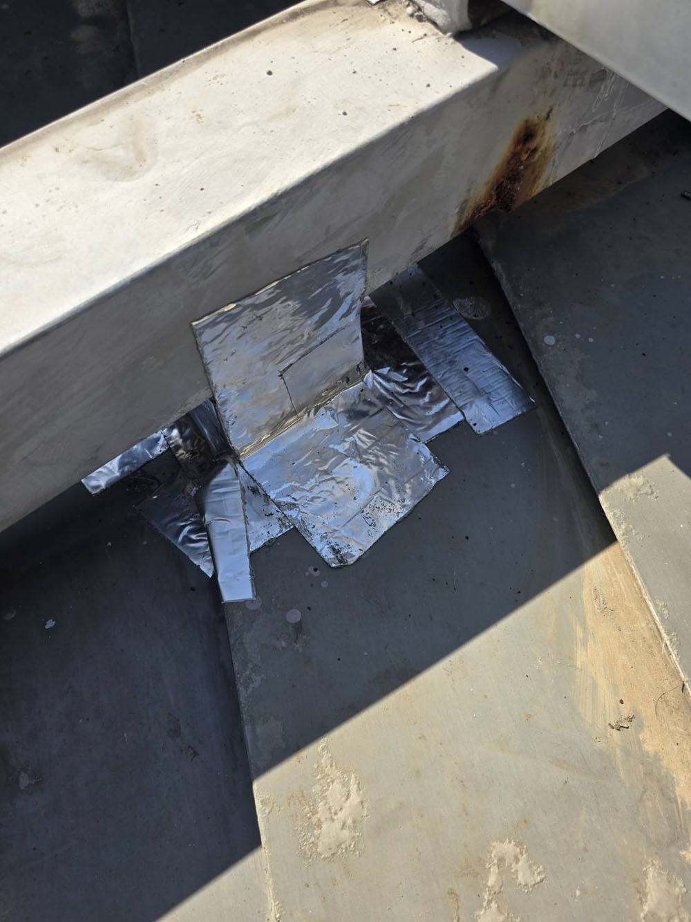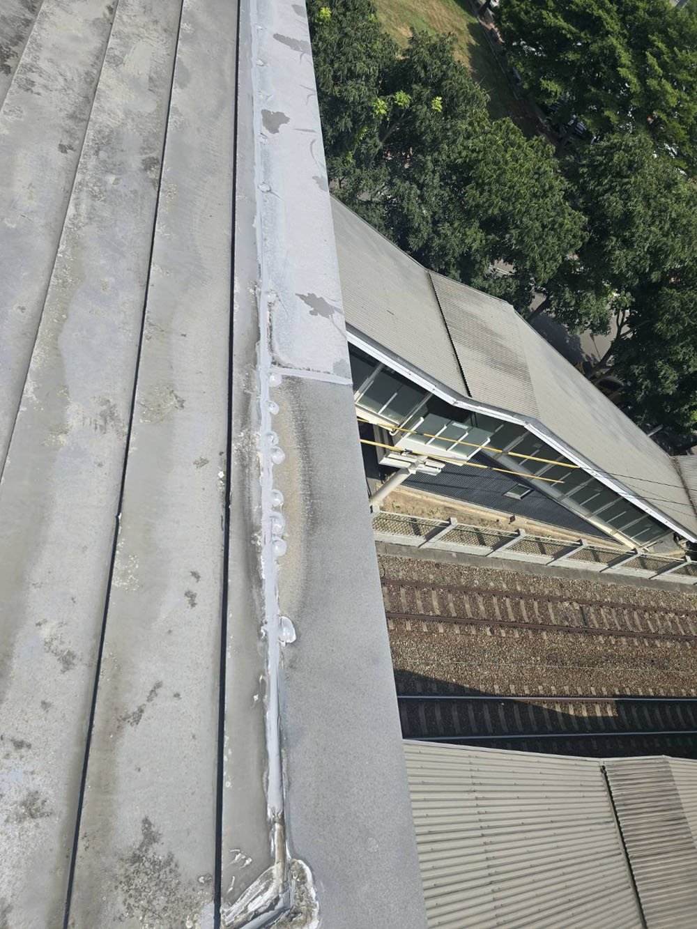 現場勘查發現屋頂太陽能板下方鐵件與穿孔座鏽蝕,雨水沿固定螺栓與微裂縫滲入。處理流程包含鏽蝕清除與防鏽處理、墊片與止水圈更新,穿孔與收邊處以高彈性PU封堵,座腳四周加貼補強布後施作彈性塗膜多道塗佈,並同步加強排水溝、伸縮縫。完工進行24小時積水測試與熱循環觀察,確認無滲漏再交付。