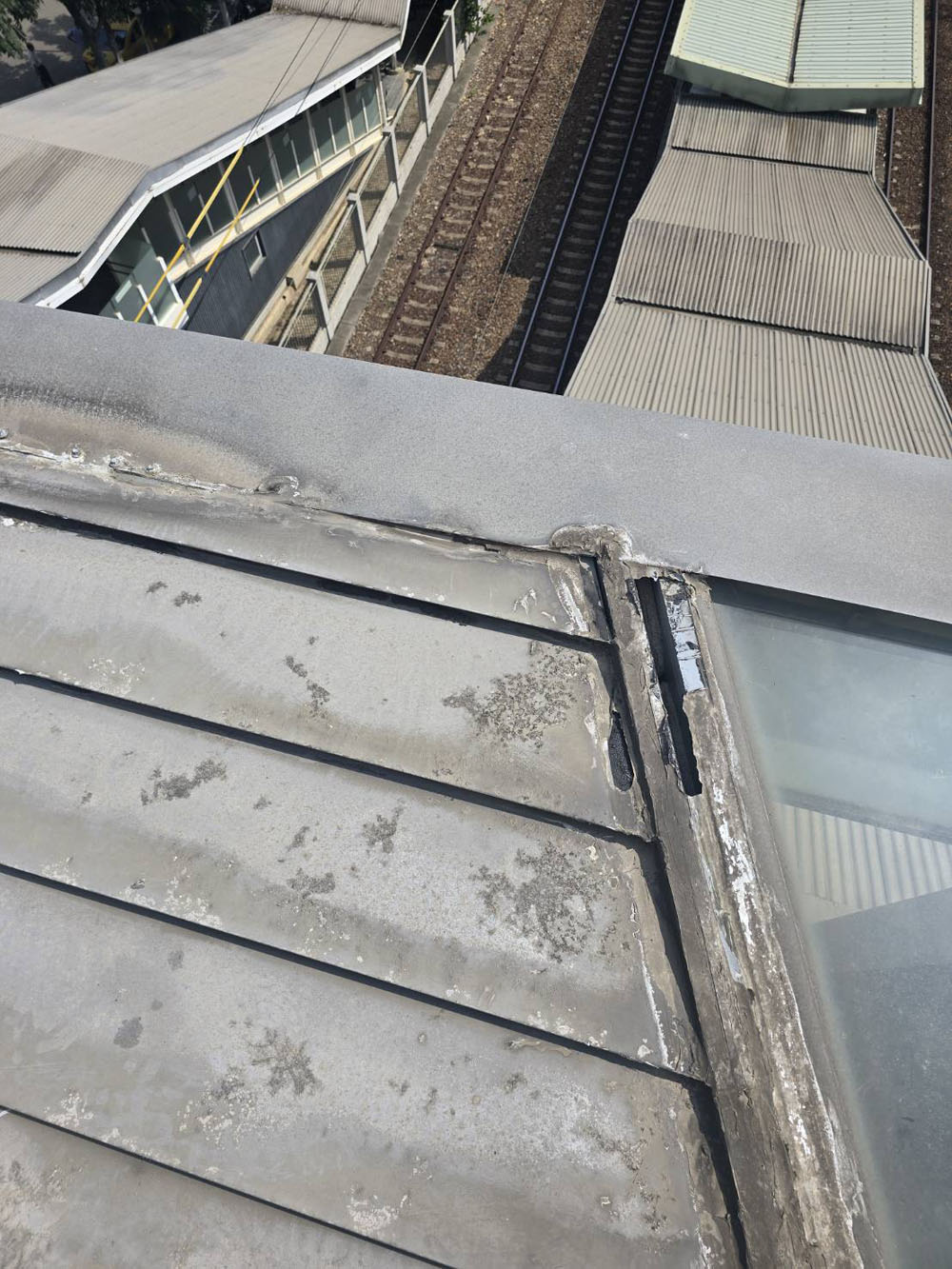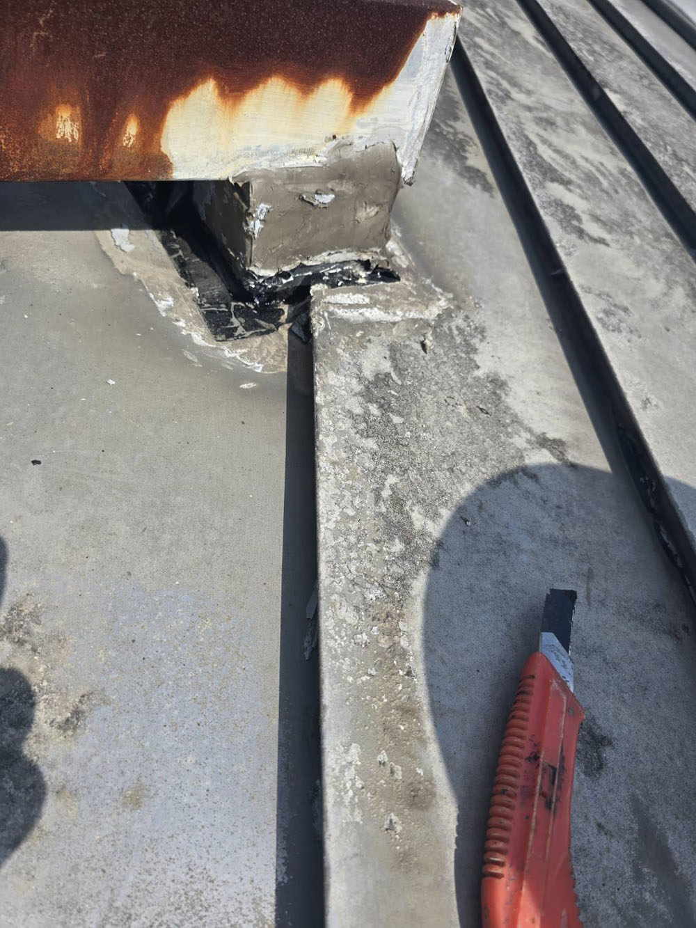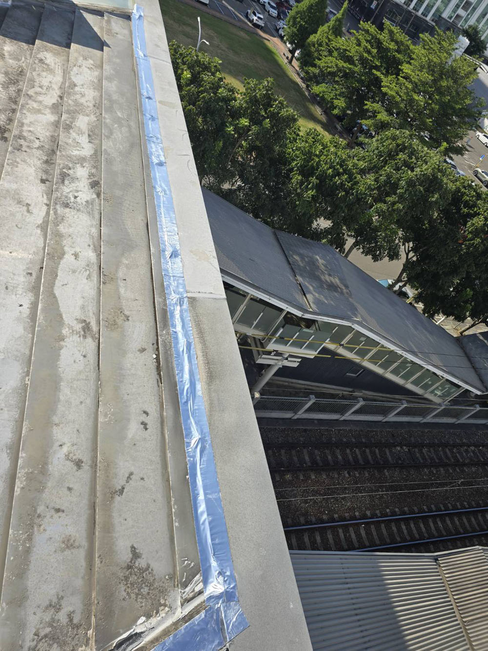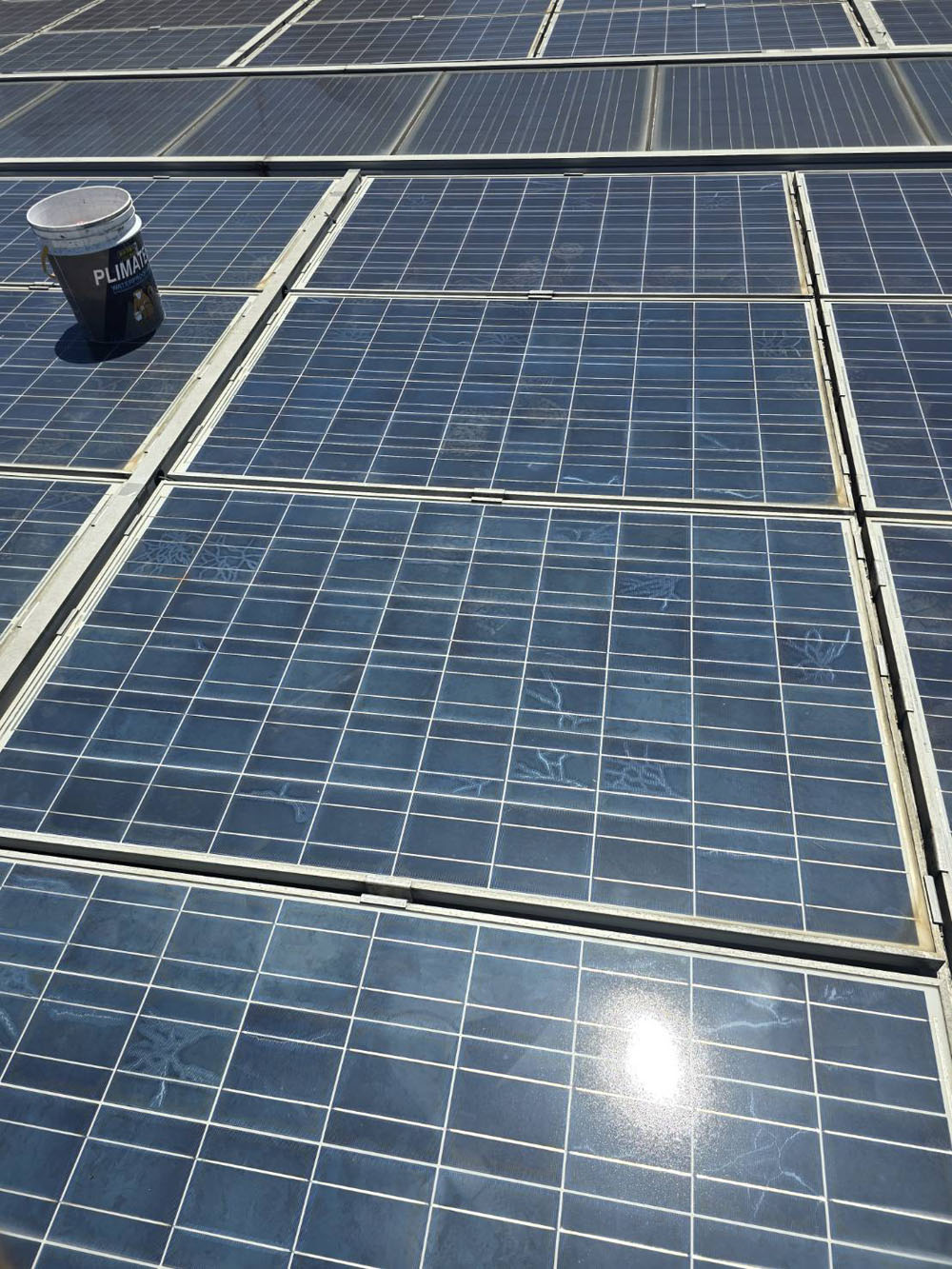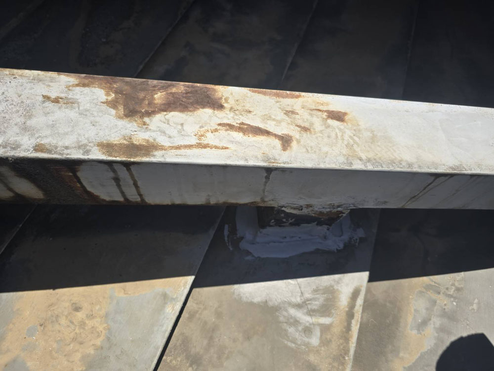 現場勘查發現屋頂太陽能板下方鐵件與穿孔座鏽蝕,雨水沿固定螺栓與微裂縫滲入。處理流程包含鏽蝕清除與防鏽處理、墊片與止水圈更新,穿孔與收邊處以高彈性PU封堵,座腳四周加貼補強布後施作彈性塗膜多道塗佈,並同步加強排水溝、伸縮縫。完工進行24小時積水測試與熱循環觀察,確認無滲漏再交付。