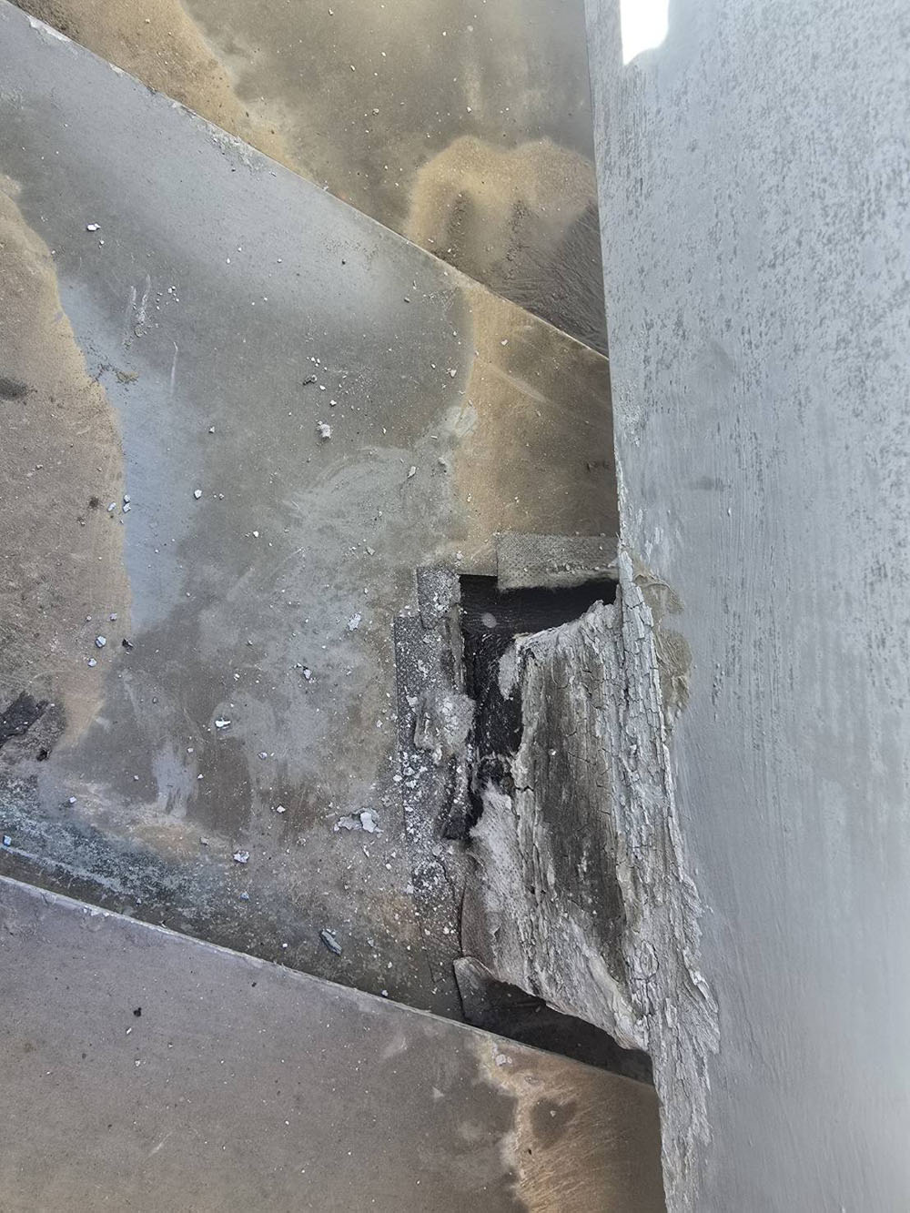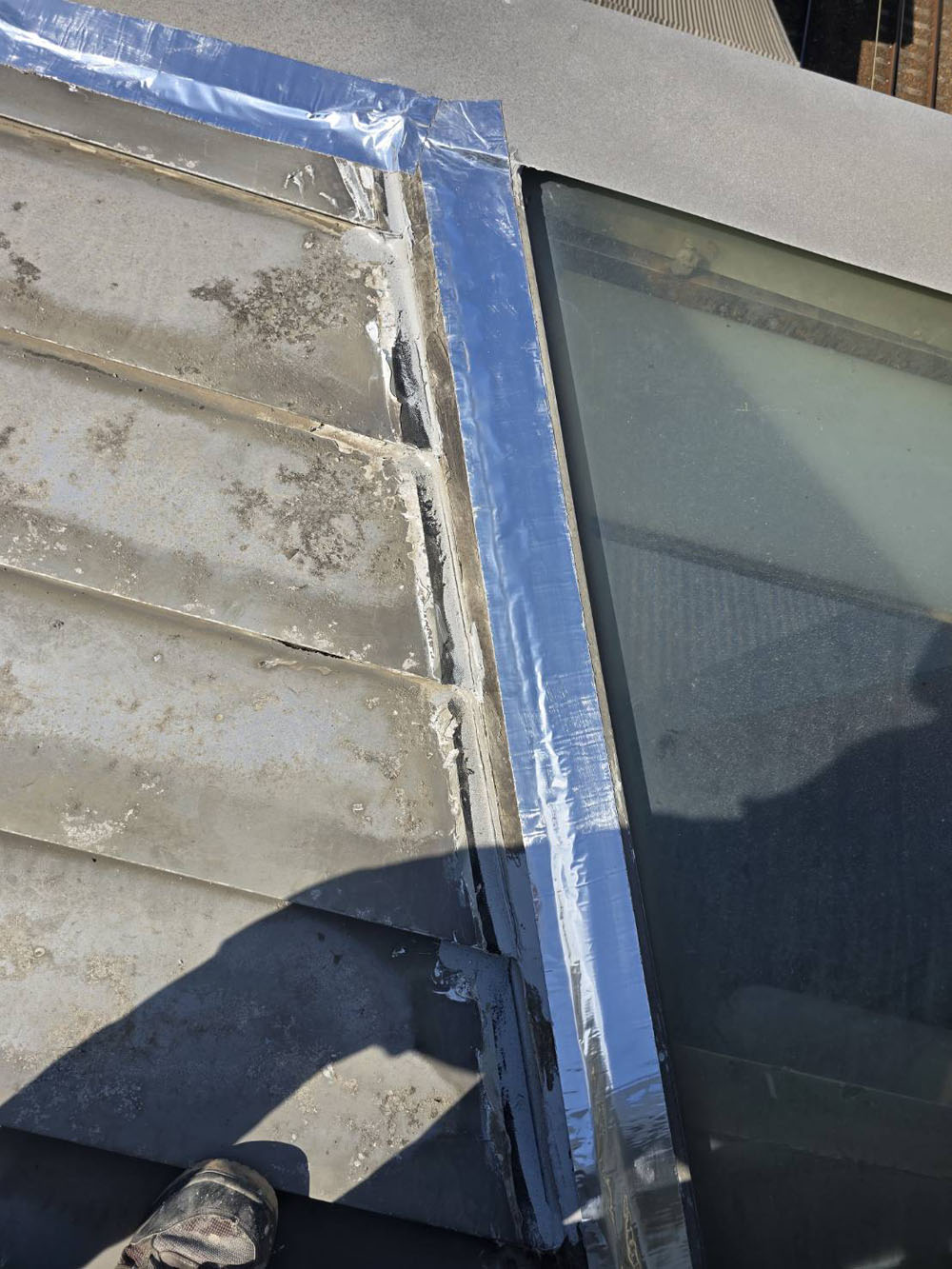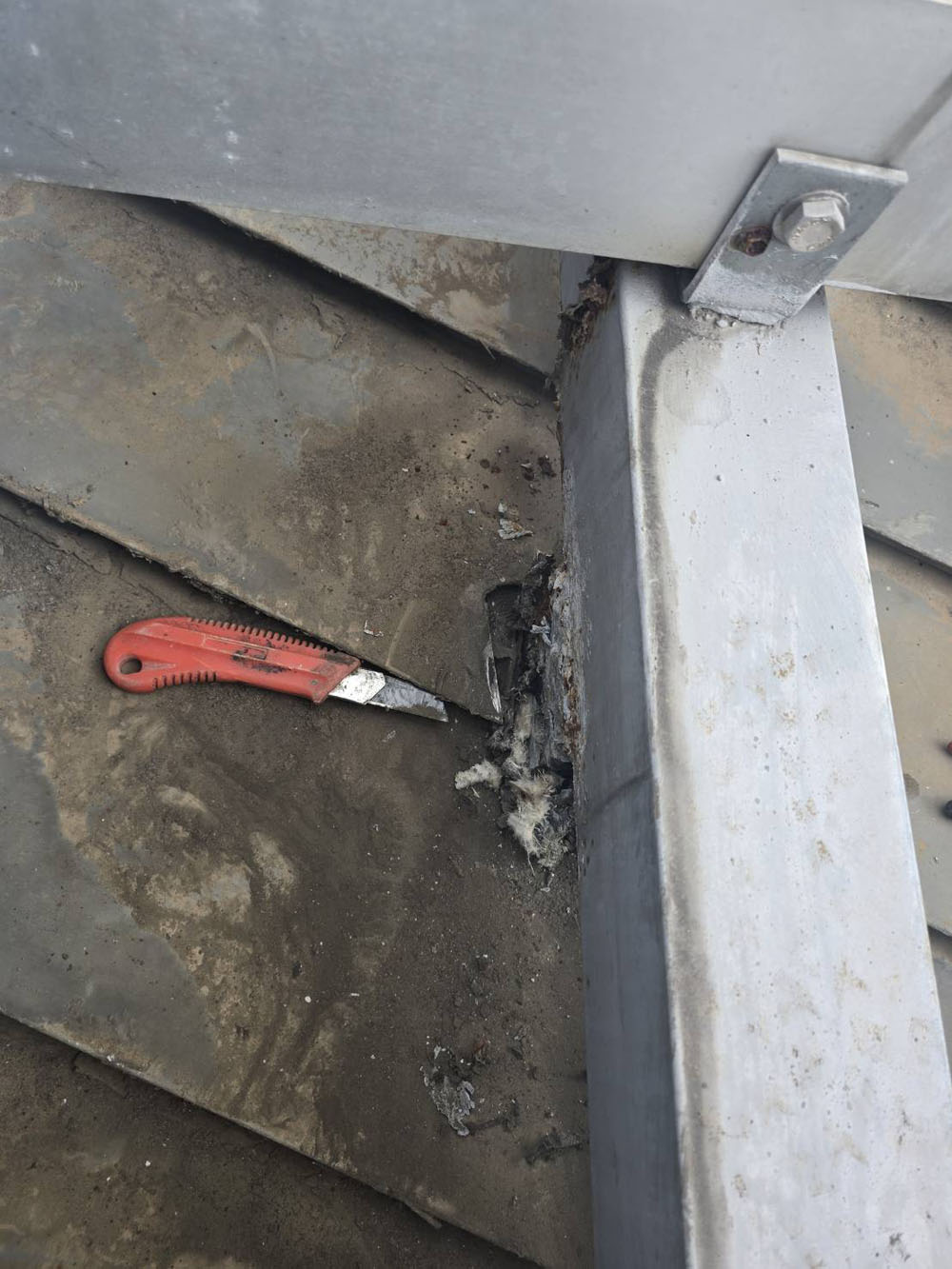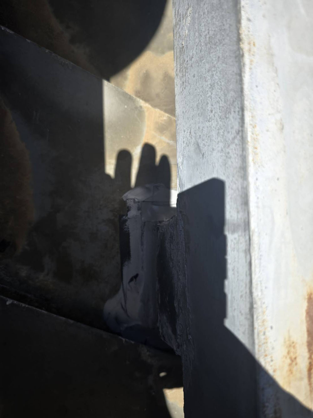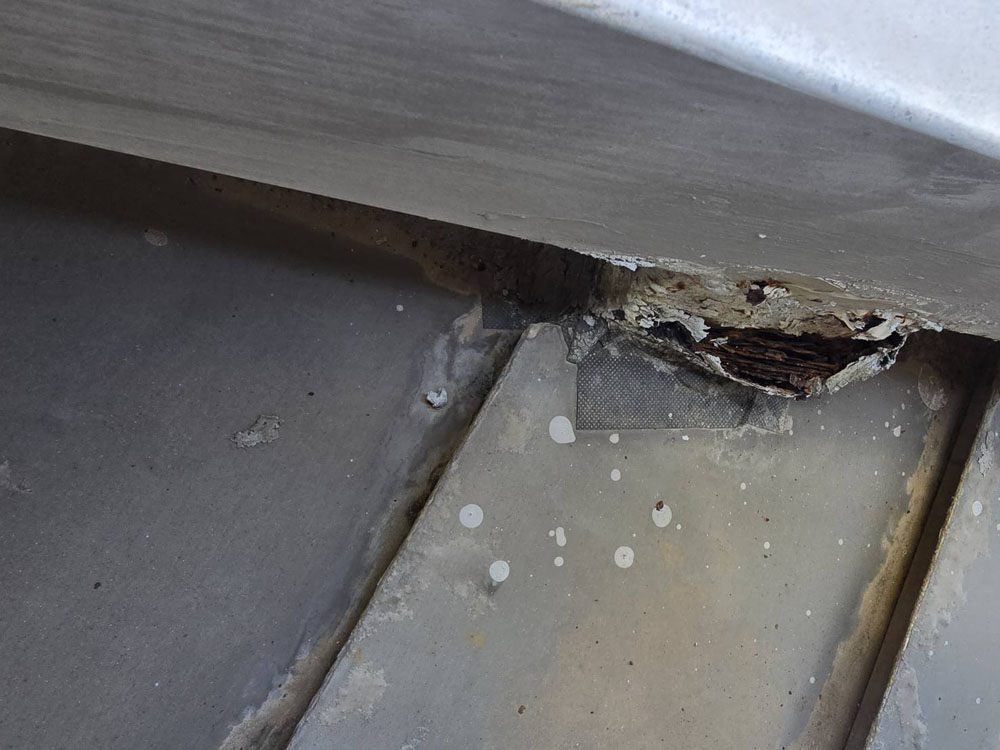 現場勘查發現屋頂太陽能板下方鐵件與穿孔座鏽蝕,雨水沿固定螺栓與微裂縫滲入。處理流程包含鏽蝕清除與防鏽處理、墊片與止水圈更新,穿孔與收邊處以高彈性PU封堵,座腳四周加貼補強布後施作彈性塗膜多道塗佈,並同步加強排水溝、伸縮縫。完工進行24小時積水測試與熱循環觀察,確認無滲漏再交付。