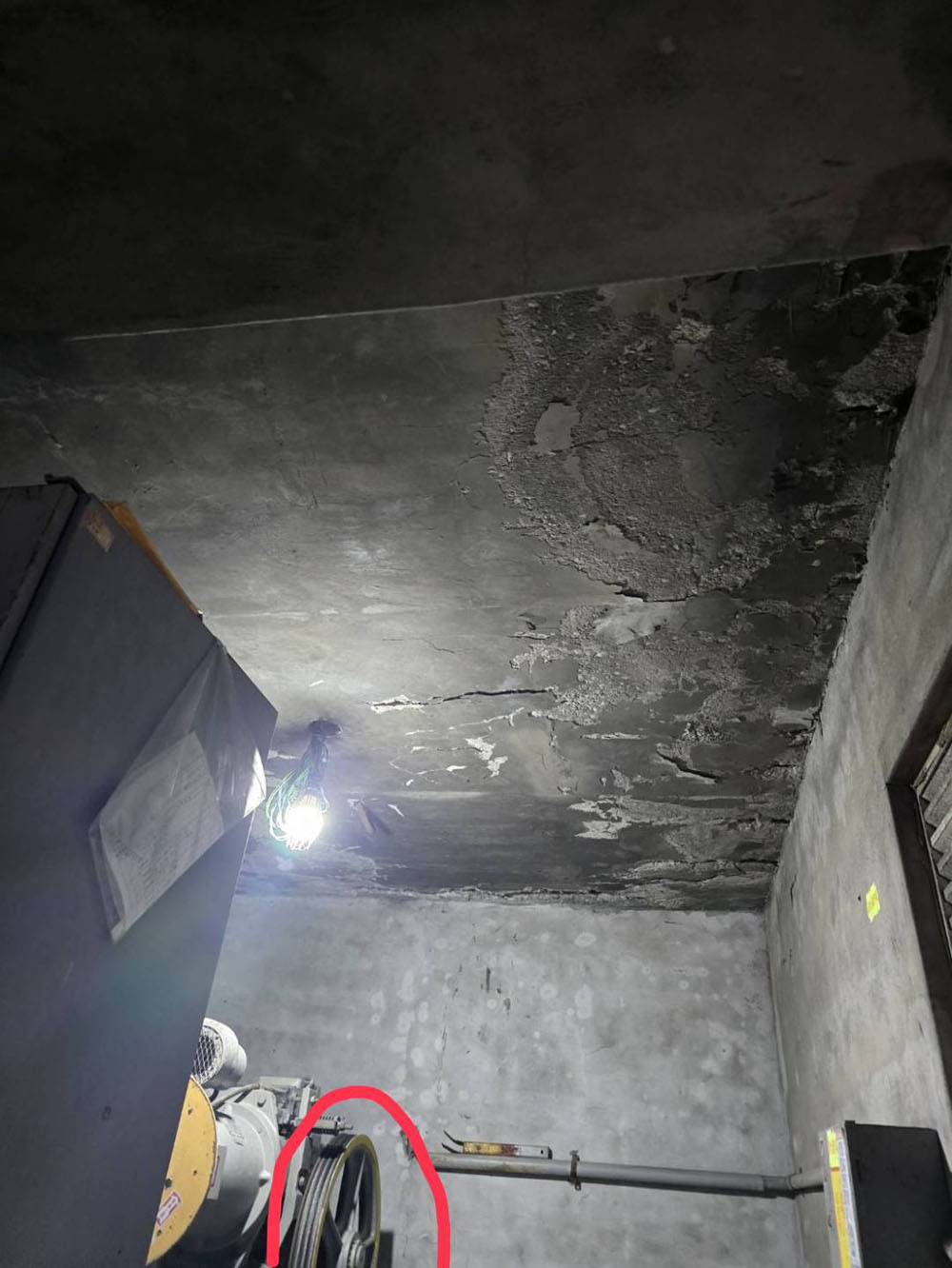 本案為電梯機房天花板水泥剝落情形,現場可見局部結構鬆動並有掉落風險,施工前先進行安全評估與掉落範圍確認,並設置防護措施避免二次損害,隨後進行鬆動水泥清除與基層整理,再施作結構補強與防護塗層,提升整體穩定性與耐久度,同時確保機房設備安全運作。