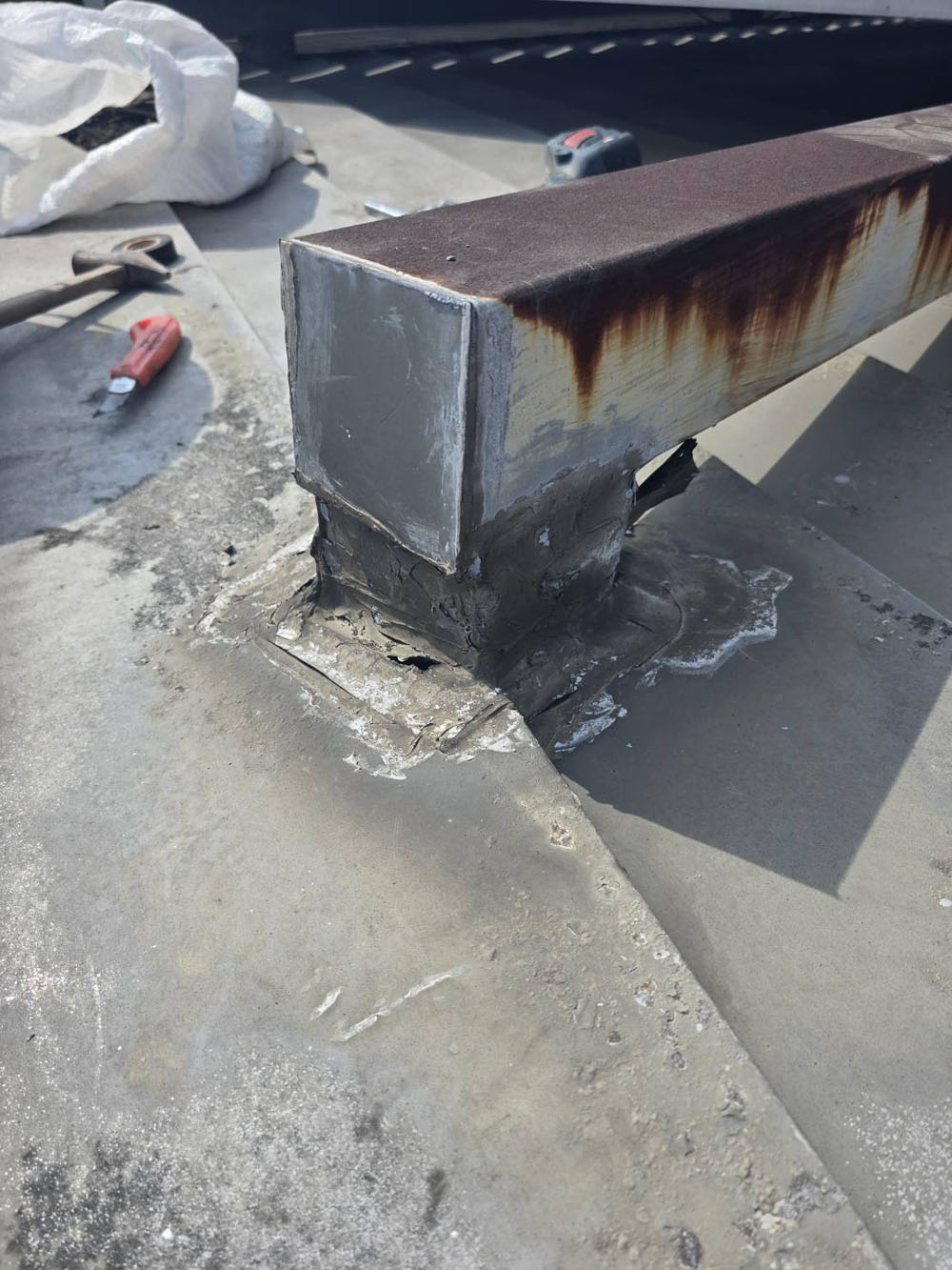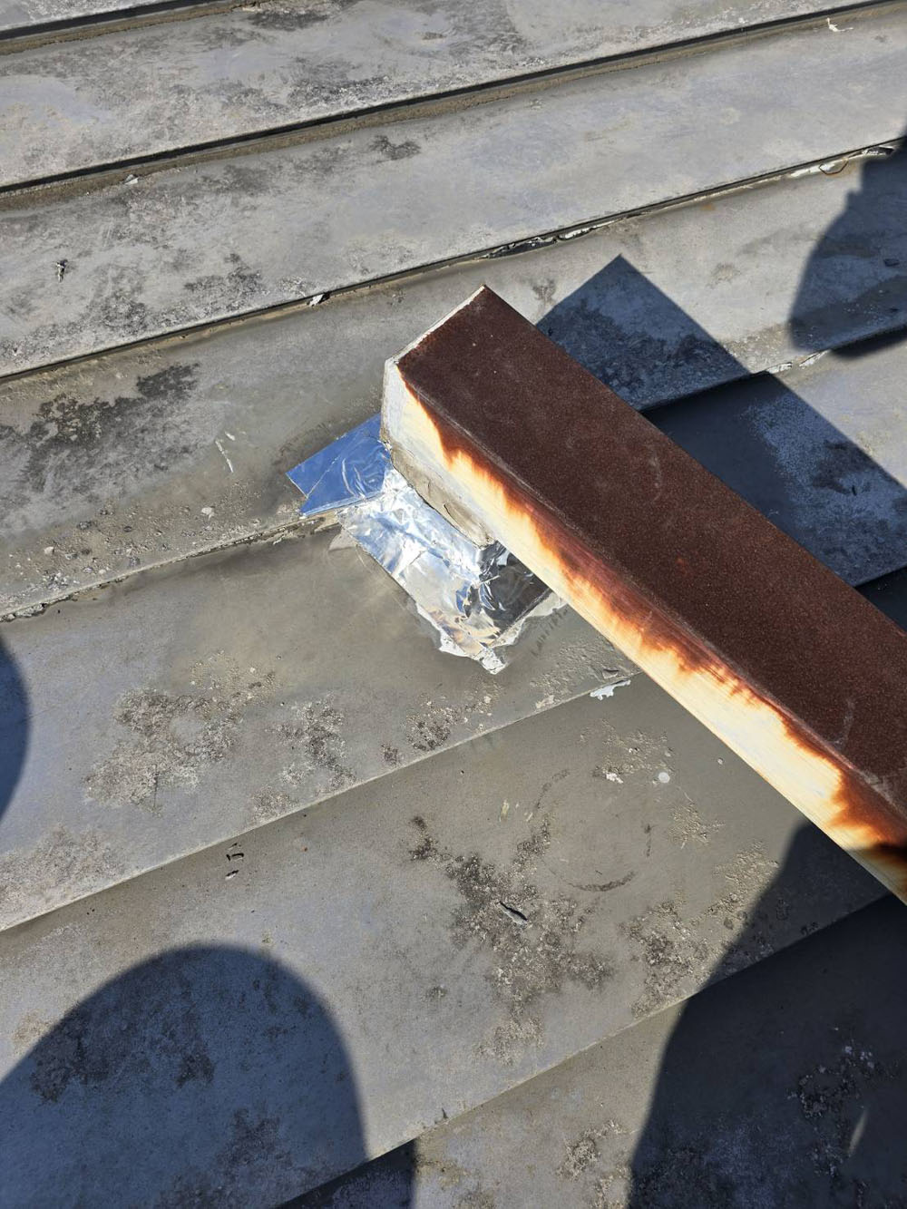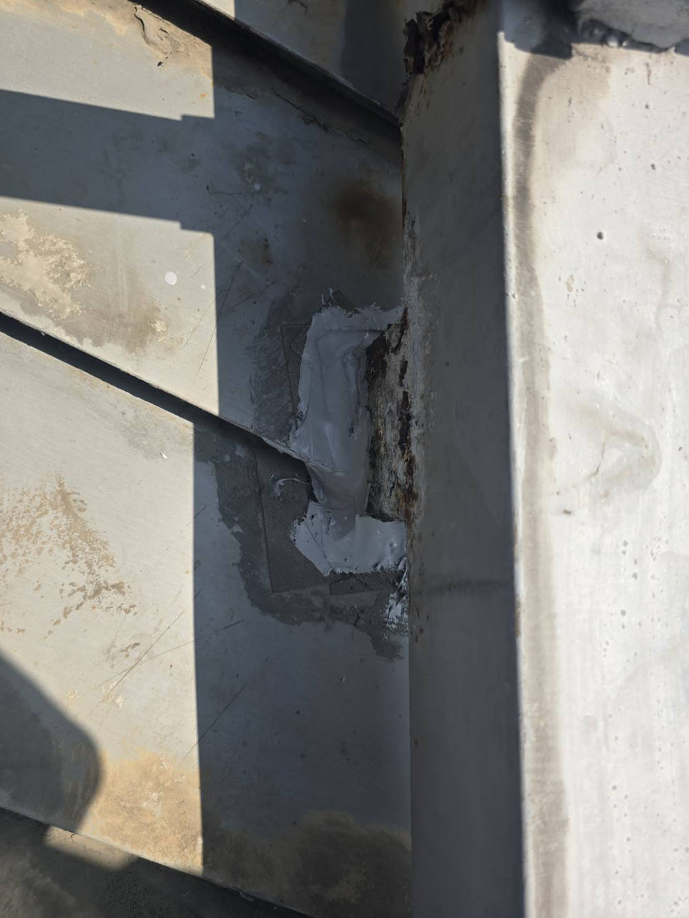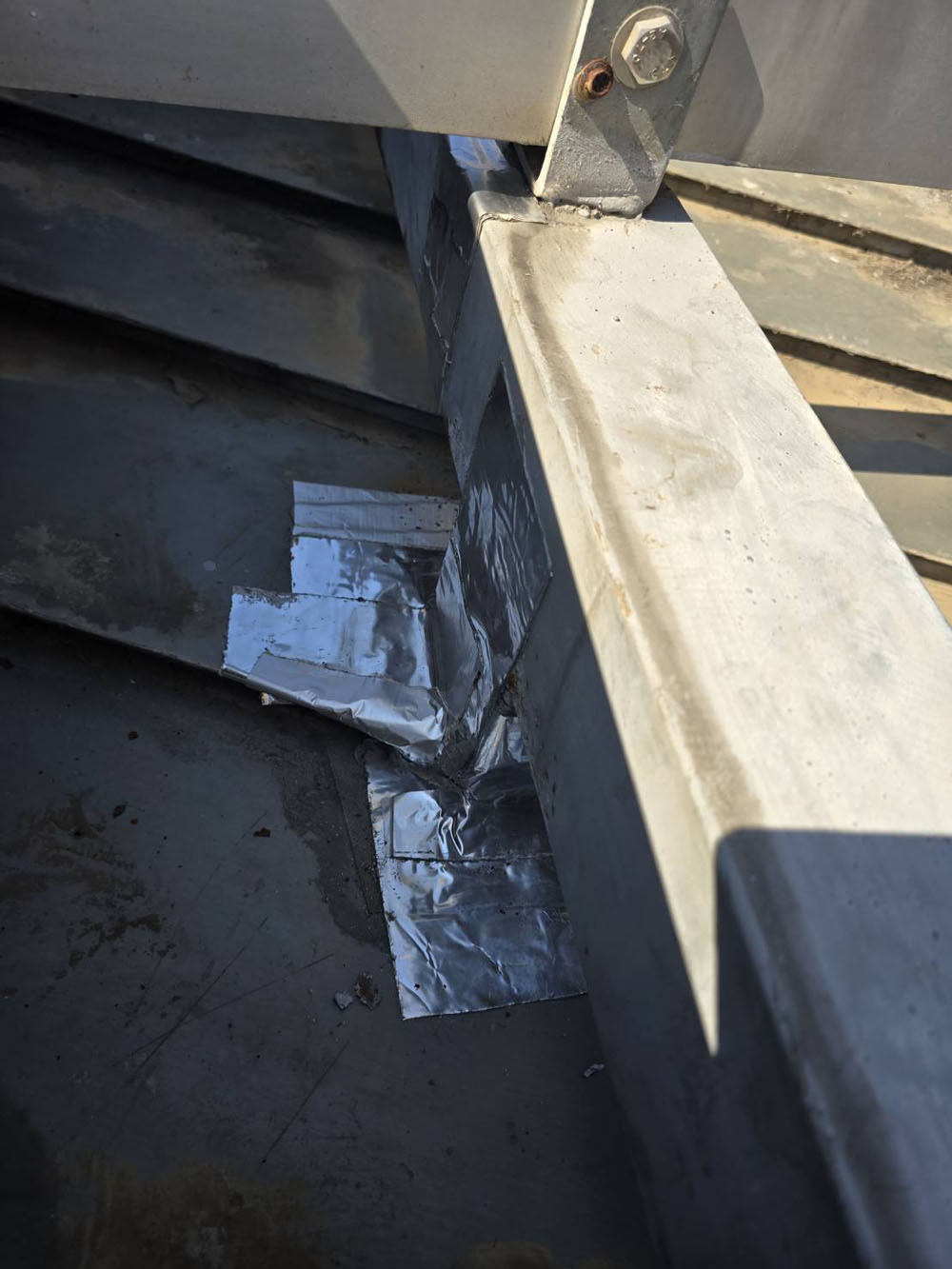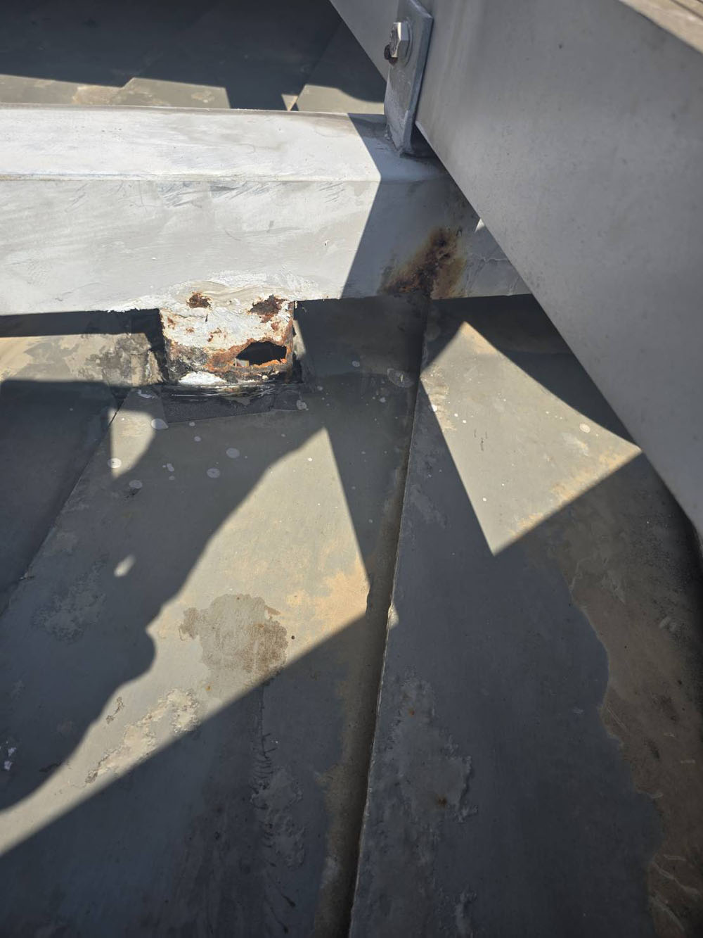 現場勘查發現屋頂太陽能板下方鐵件與穿孔座鏽蝕,雨水沿固定螺栓與微裂縫滲入。處理流程包含鏽蝕清除與防鏽處理、墊片與止水圈更新,穿孔與收邊處以高彈性PU封堵,座腳四周加貼補強布後施作彈性塗膜多道塗佈,並同步加強排水溝、伸縮縫。完工進行24小時積水測試與熱循環觀察,確認無滲漏再交付。