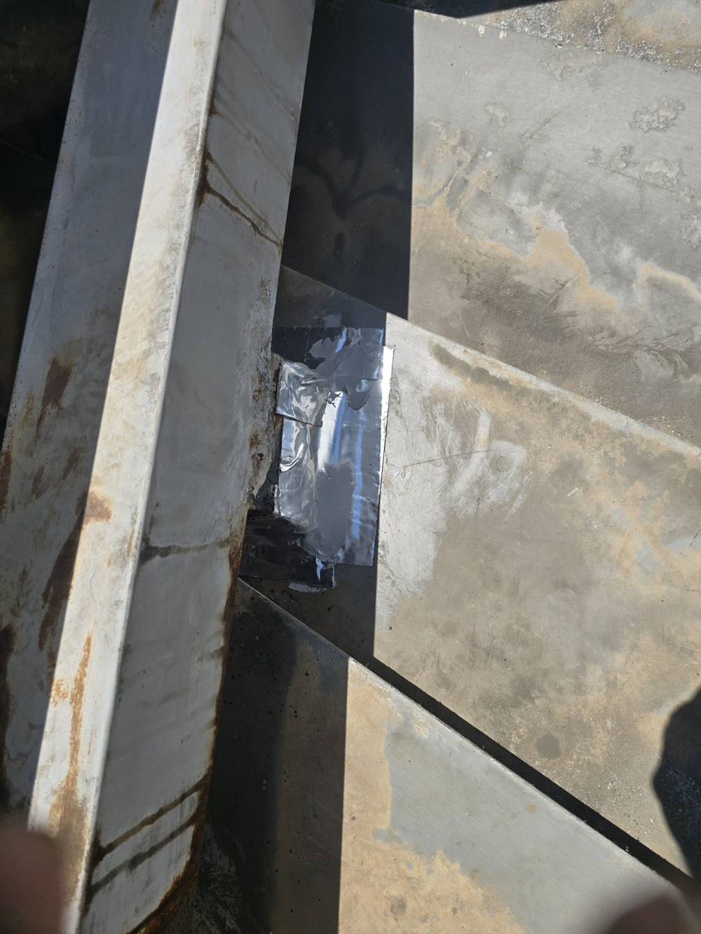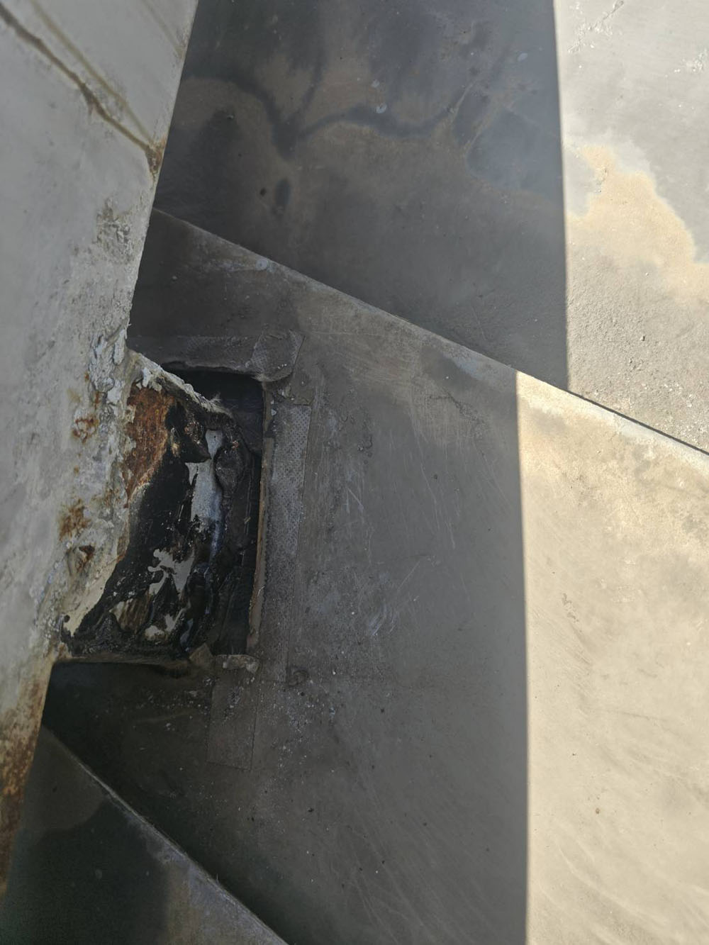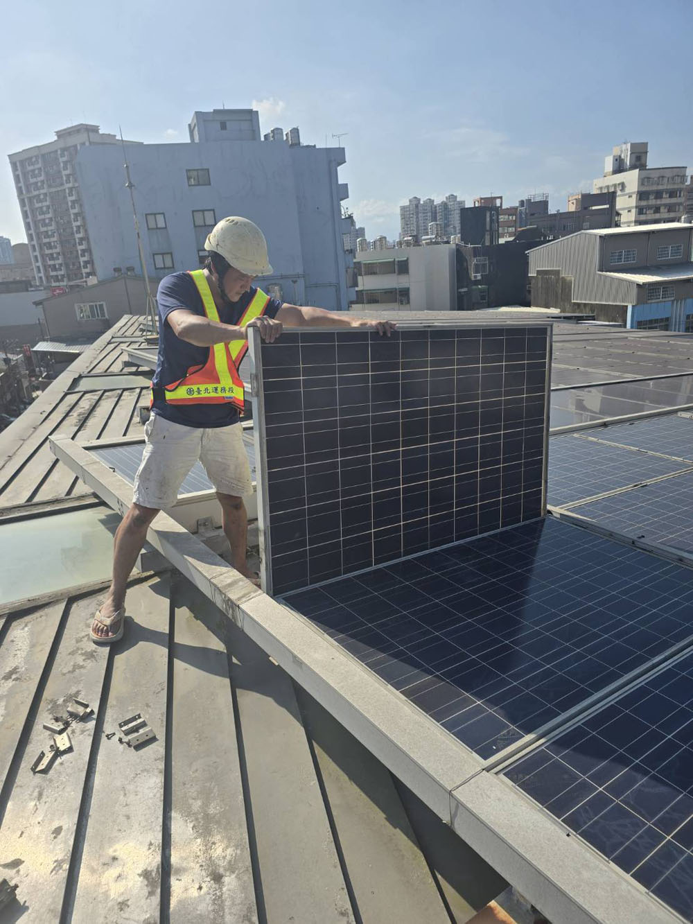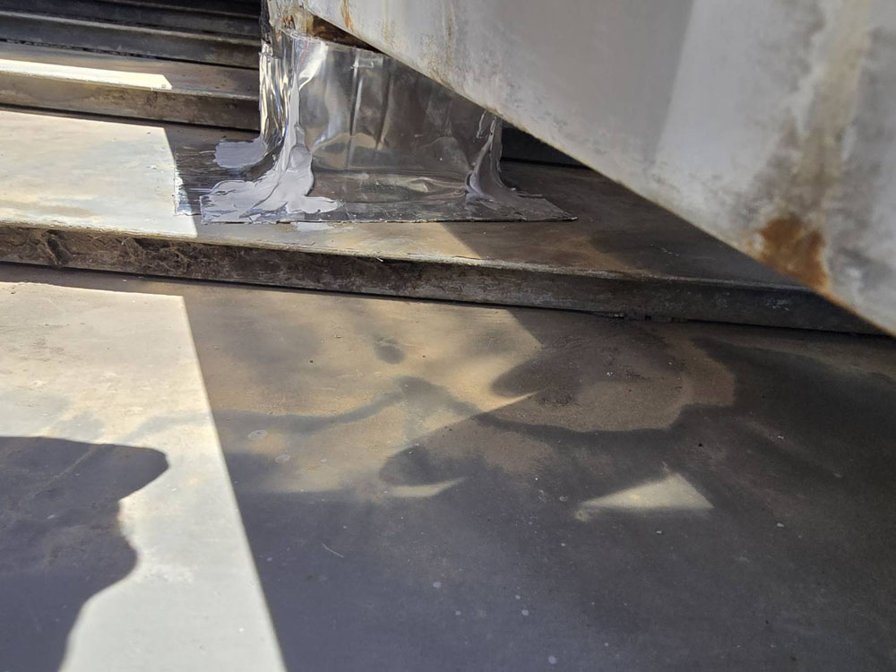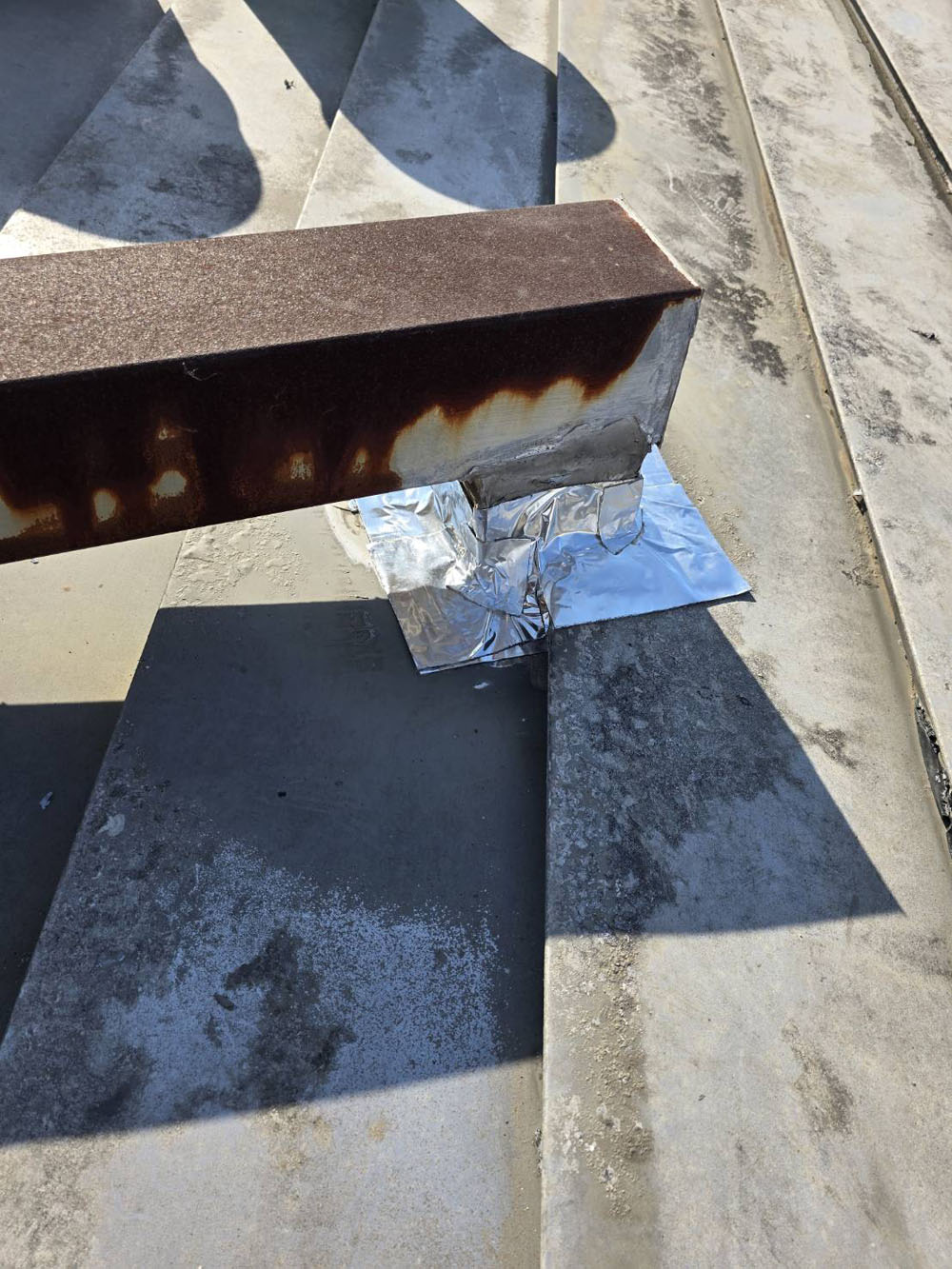 現場勘查發現屋頂太陽能板下方鐵件與穿孔座鏽蝕,雨水沿固定螺栓與微裂縫滲入。處理流程包含鏽蝕清除與防鏽處理、墊片與止水圈更新,穿孔與收邊處以高彈性PU封堵,座腳四周加貼補強布後施作彈性塗膜多道塗佈,並同步加強排水溝、伸縮縫。完工進行24小時積水測試與熱循環觀察,確認無滲漏再交付。