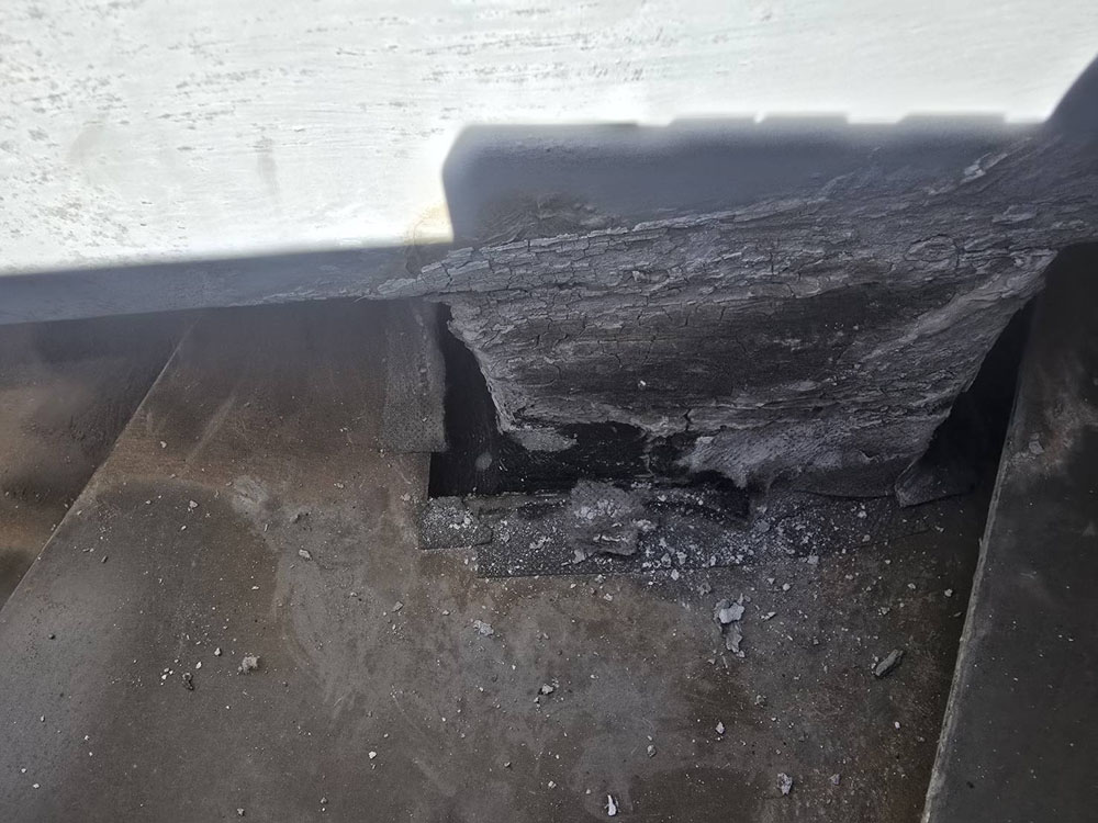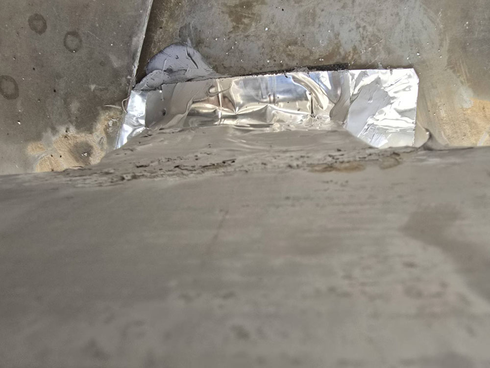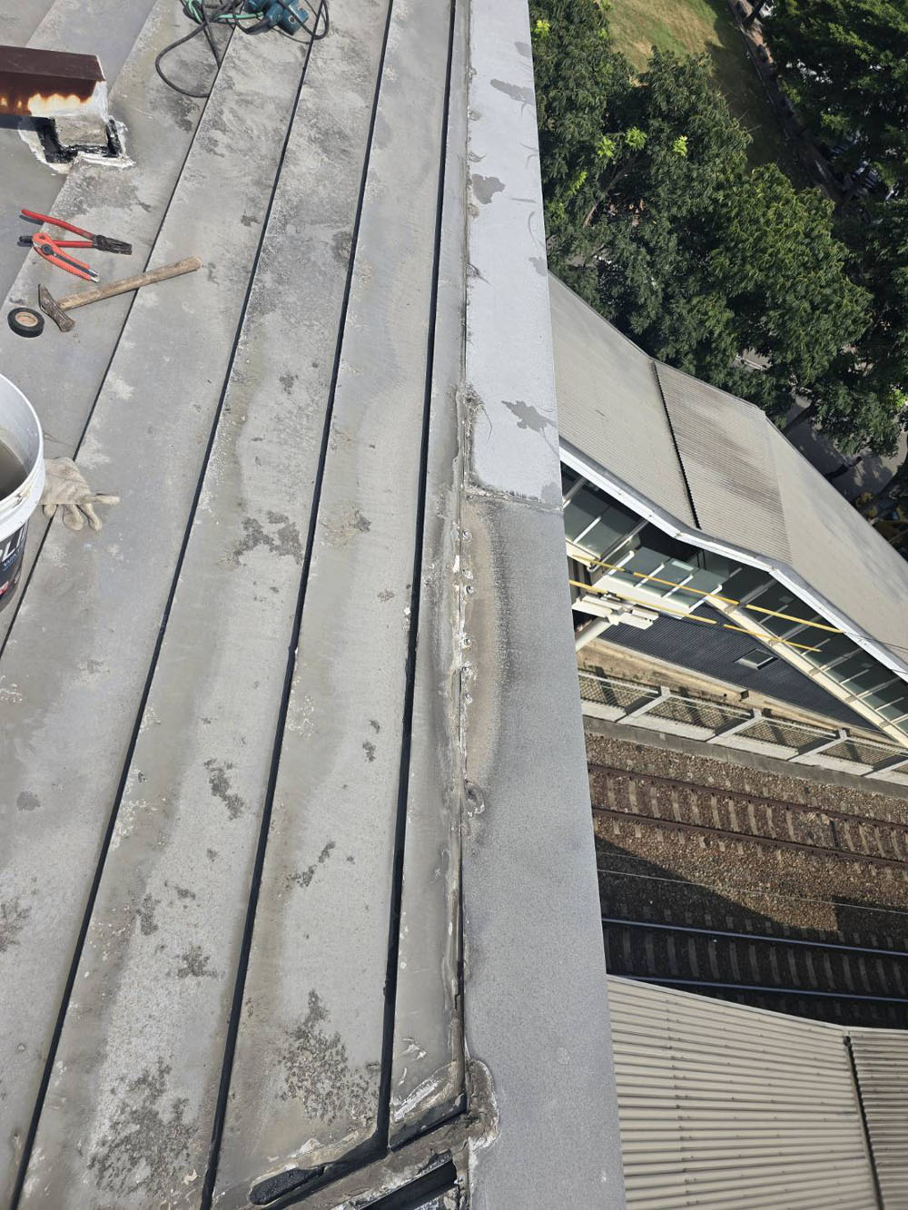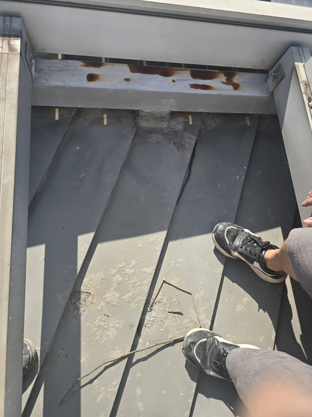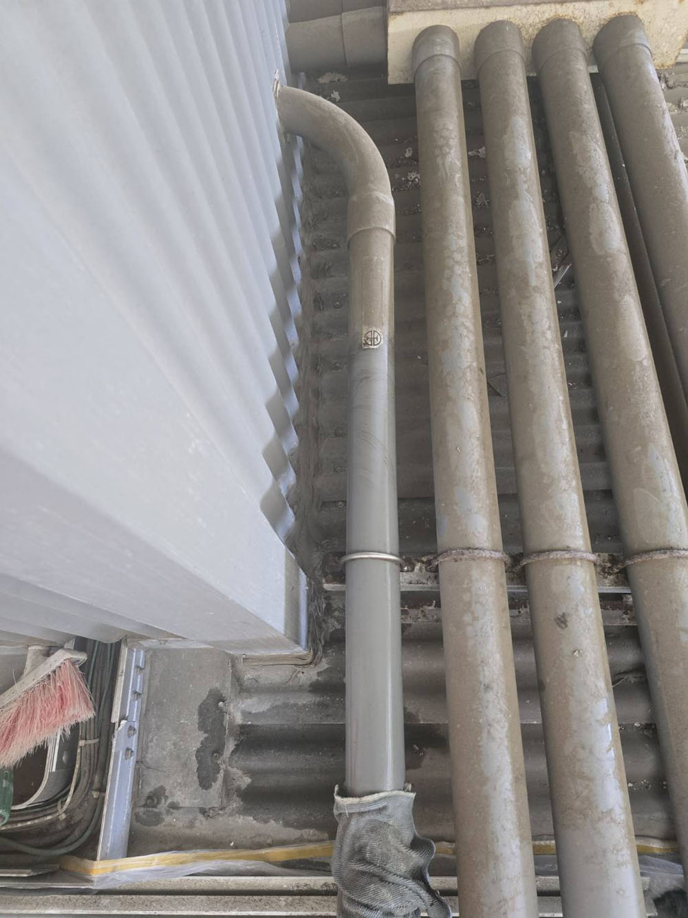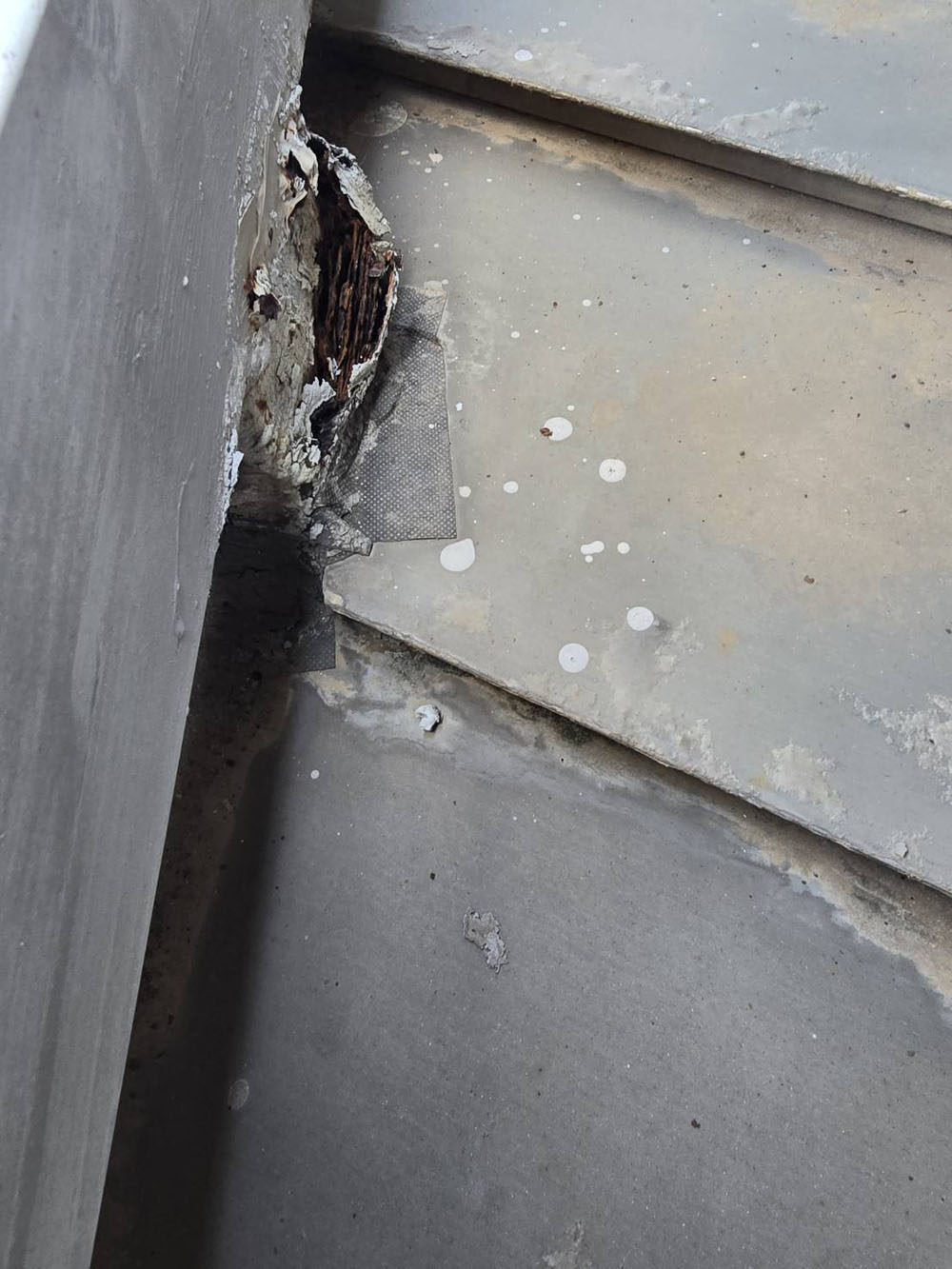 現場勘查發現屋頂太陽能板下方鐵件與穿孔座鏽蝕,雨水沿固定螺栓與微裂縫滲入。處理流程包含鏽蝕清除與防鏽處理、墊片與止水圈更新,穿孔與收邊處以高彈性PU封堵,座腳四周加貼補強布後施作彈性塗膜多道塗佈,並同步加強排水溝、伸縮縫。完工進行24小時積水測試與熱循環觀察,確認無滲漏再交付。
